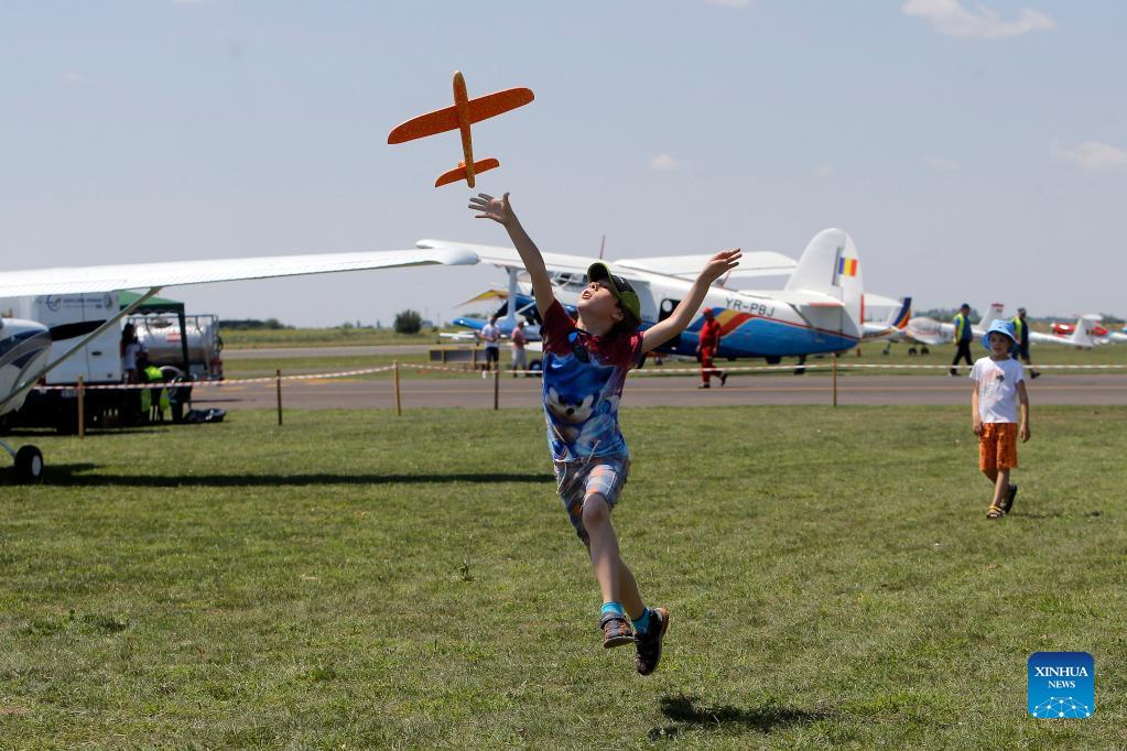 A child plays with a toy airplane during Aero Expo Fest near Bucharest, Romania, on June 25, 2022. (Photo by Cristian Cristel/Xinhua)
