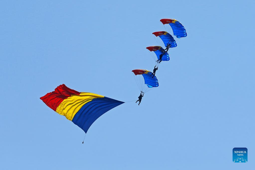 A parachute team performs during Aero Expo Fest near Bucharest, Romania, on June 25, 2022. (Photo by Cristian Cristel/Xinhua)
