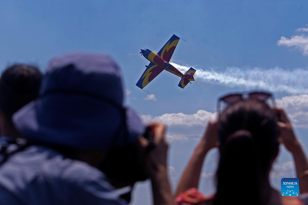 An aerobatic plane performs during Aero Expo Fest near Bucharest, Romania, on June 25, 2022. (Photo by Cristian Cristel/Xinhua)