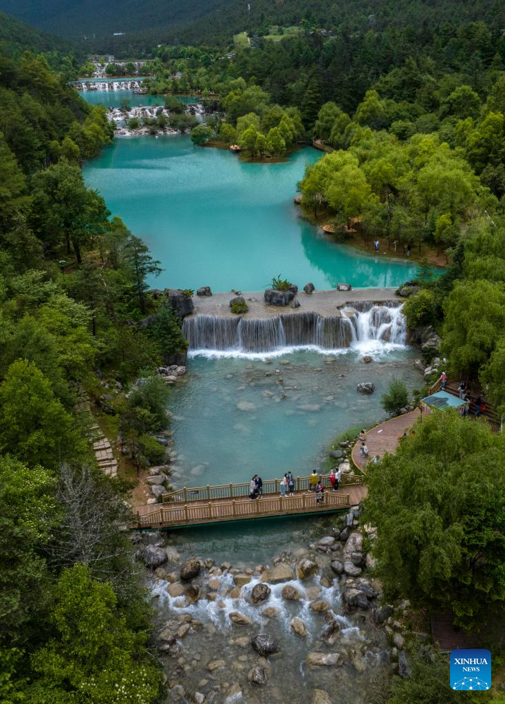 Tourists visit Blue Moon Valley at the foot of the Yulong Snow Mountain in Lijiang City, southwest China's Yunnan Province, June 26, 2022. (Xinhua/Jiang Wenyao)