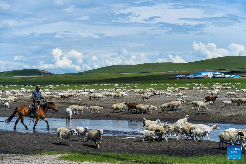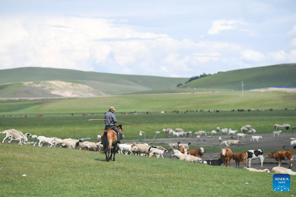 A herdsman grazes cattle and sheep on the summer pasture in Xin Barag Zuoqi of Hulun Buir City, north China's Inner Mongolia Autonomous Region, June 26, 2022. (Xinhua/Bei He)