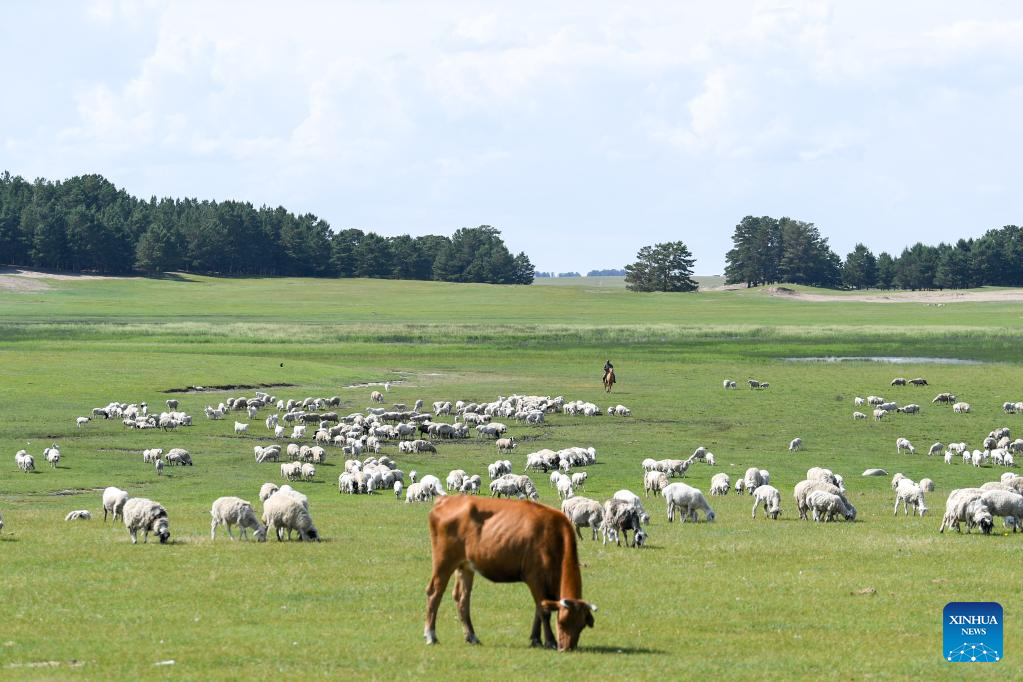 A herd of cattle and sheep graze on the summer pasture in Xin Barag Zuoqi of Hulun Buir City, north China's Inner Mongolia Autonomous Region, June 26, 2022. (Xinhua/Bei He)
