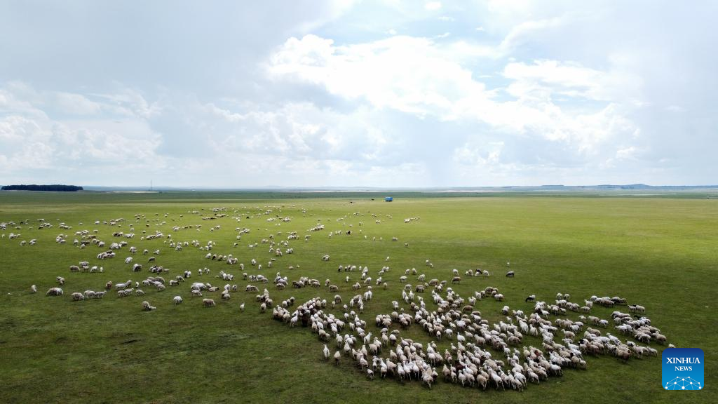 Aerial photo taken on June 26, 2022 shows a herd of sheep on the summer pasture in Xin Barag Zuoqi of Hulun Buir City, north China's Inner Mongolia Autonomous Region. (Xinhua/Bei He)