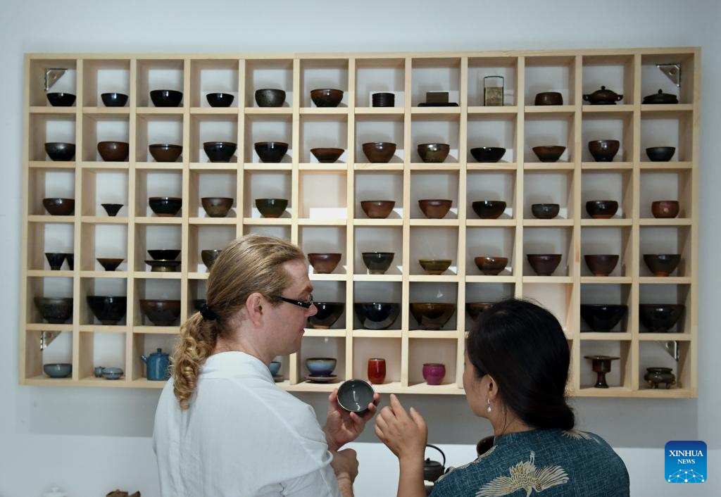 David Mills (R) and Shang Na check tea ware in Zhengzhou, central China's Henan Province, June 22, 2022.
