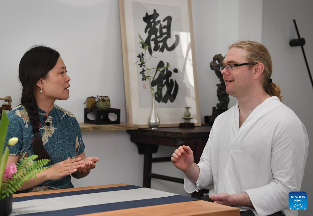 With the encouragement and support from local authorities, David and Shang Na are trying various ways to promote traditional Chinese tea culture such as establishing a website and choreographing tea-themed dances. (Xinhua/Li An)