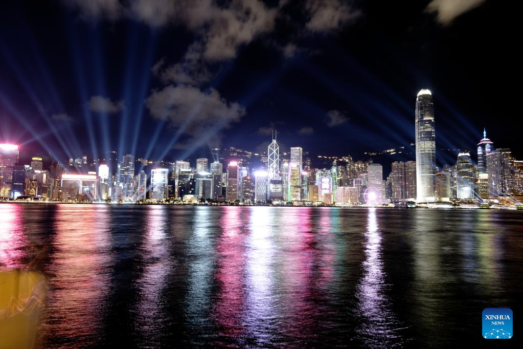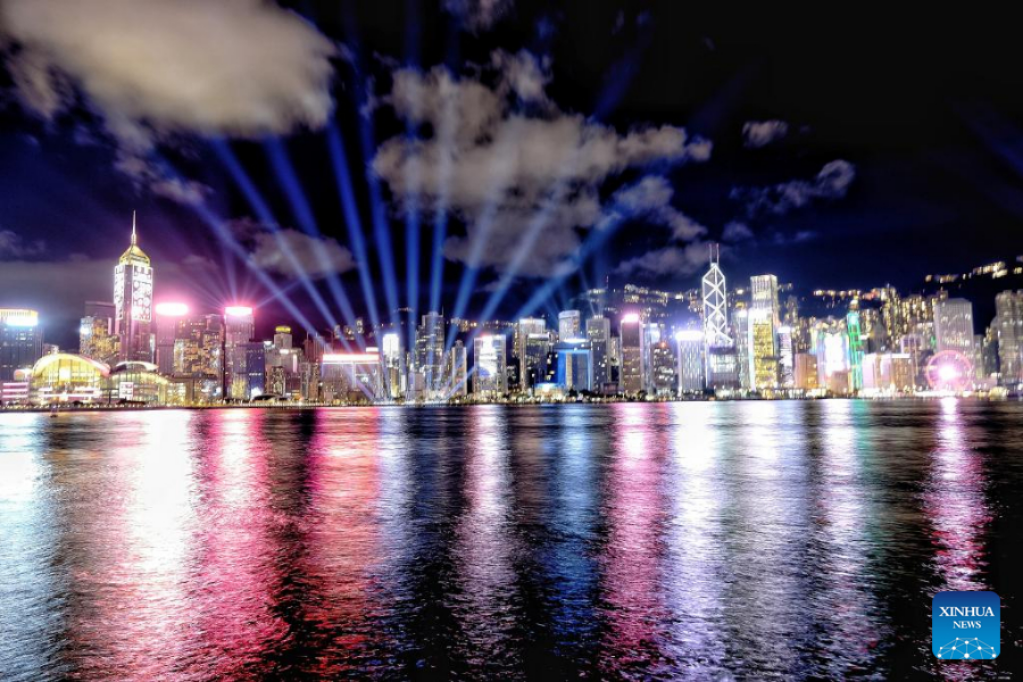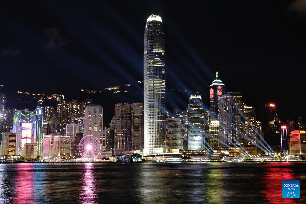 Photo taken on June 25, 2022 shows a light show in Tsim Sha Tsui, south China's Hong Kong. Hong Kong will celebrate the 25th anniversary of its return to the motherland. (Xinhua/Wang Shen)
