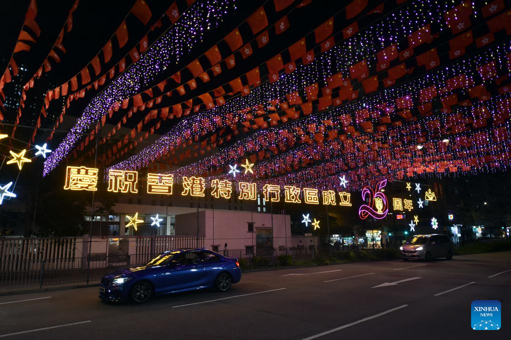 A street is adorned with colorful lights in Tsuen Wan, south China's Hong Kong, June 25, 2022. Hong Kong will celebrate the 25th anniversary of its return to the motherland. (Xinhua/Lo Ping Fai)