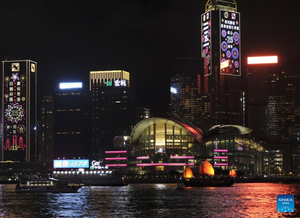 Photo taken on June 25, 2022 shows buildings with light installations in Tsim Sha Tsui, south China's Hong Kong. Hong Kong will celebrate the 25th anniversary of its return to the motherland. (Xinhua/Wang Shen)