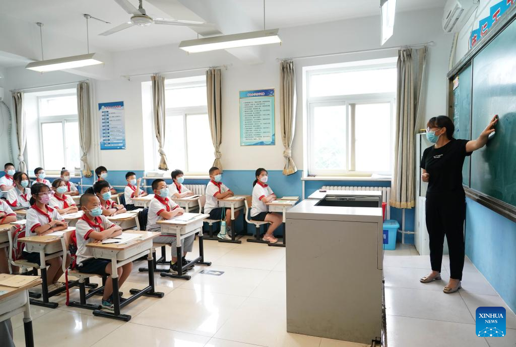 Students are having a maths class at the Pinggu campus of Beijing No. 2 Experimental Primary School in Beijing, capital of China, June 27, 2022. Beijing's primary and middle school students returned to campus on Monday after over 50 days of remote education due to a local COVID-19 resurgence.