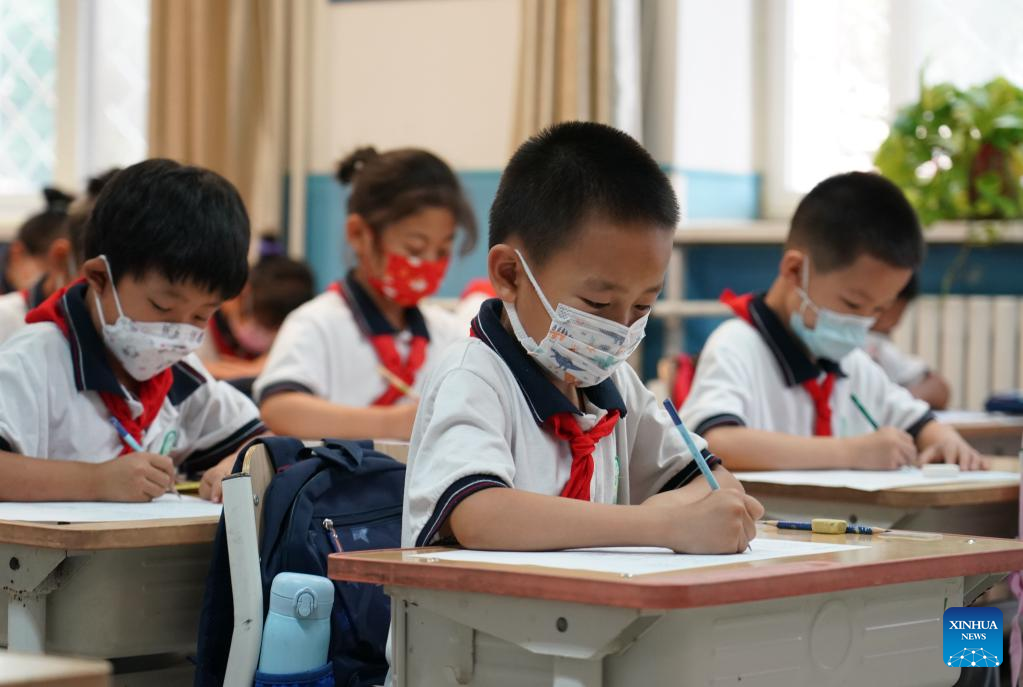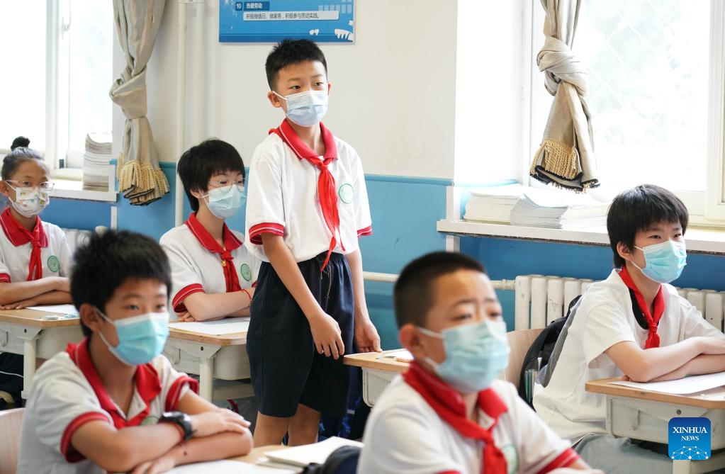 Students are having a Chinese class at the Pinggu campus of Beijing No. 2 Experimental Primary School in Beijing, capital of China, June 27, 2022. Beijing's primary and middle school students returned to campus on Monday after over 50 days of remote education due to a local COVID-19 resurgence.