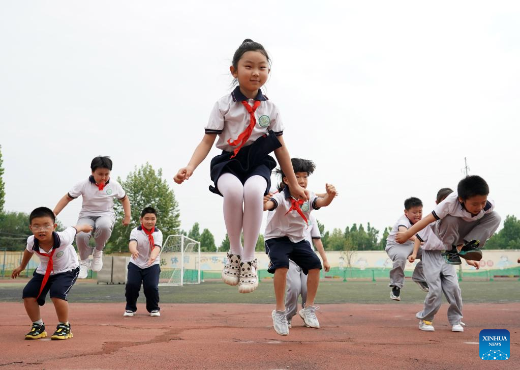 Students have a physical education class at the Pinggu campus of Beijing No. 2 Experimental Primary School in Beijing, capital of China, June 27, 2022. Beijing's primary and middle school students returned to campus on Monday after over 50 days of remote education due to a local COVID-19 resurgence.
