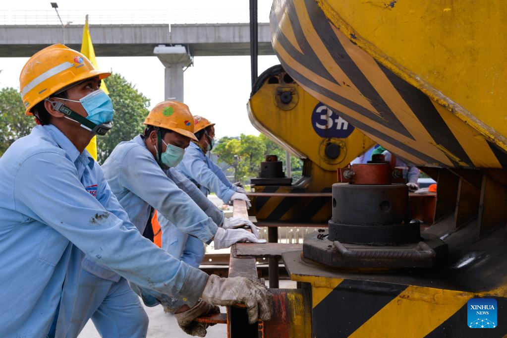 Workers operate for the erection of the last box girder of the No.1 casting yard of the Jakarta-Bandung High-Speed Railway (HSR) in Bekasi, Indonesia, June 27, 2022. The No.1 casting yard of the Jakarta-Bandung High-Speed Railway (HSR) on Monday completed the erection of 1,018 box girders, laying a solid foundation for the completion of the railway project in June 2023. (Xinhua/Xu Qin)