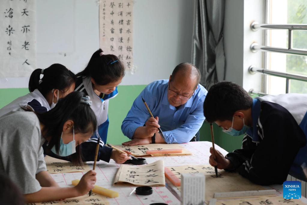 Students learn calligraphy in Tianshui Special Education School in Tianshui City, northwest China's Gansu Province, May 26, 2022. (Xinhua/Zhang Zhimin)