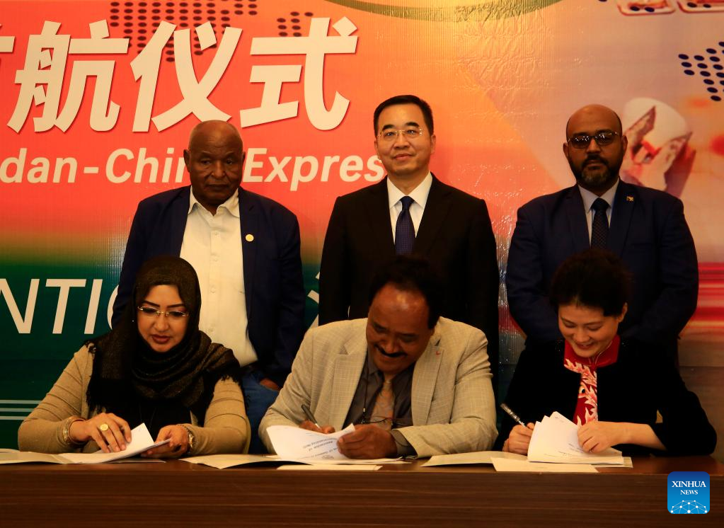 Representatives from Sudan and China attend the launching ceremony of a maritime shipping route in Khartoum, Sudan, on June 26, 2022. Sudan held the launching ceremony of Sudan-China Express, the first direct maritime shipping route between the two countries, in capital Khartoum on Sunday evening. (Photo by Mohamed Khidir/Xinhua)