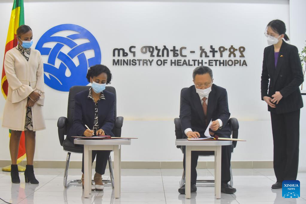 Ethiopian Minister of Health Lia Tadesse (2nd L) and Chinese Ambassador to Ethiopia Zhao Zhiyuan (2nd R) sign documents during a handover ceremony of the Chinsese COVID-19 vaccine in Addis Ababa, Ethiopia, on June 27, 2022. The Chinese government on Monday handed over an additional 10 million Sinopharm COVID-19 vaccine doses to Ethiopia. (Xinhua/Michael Tewelde)