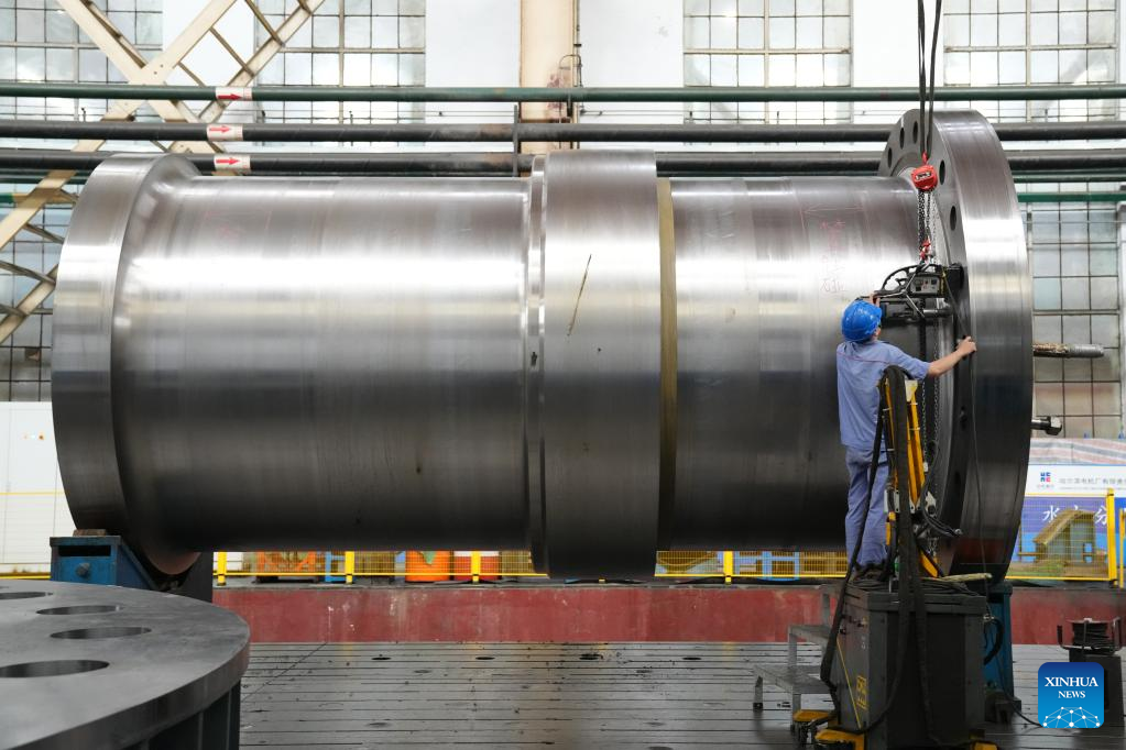 A worker is seen at a workshop at Harbin Electric Machinery Company Limited in Harbin, northeast China's Heilongjiang Province, June 27, 2022. The company maintains stable production under strict COVID-19 prevention and control measures. (Xinhua/Wang Jianwei)