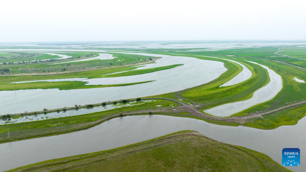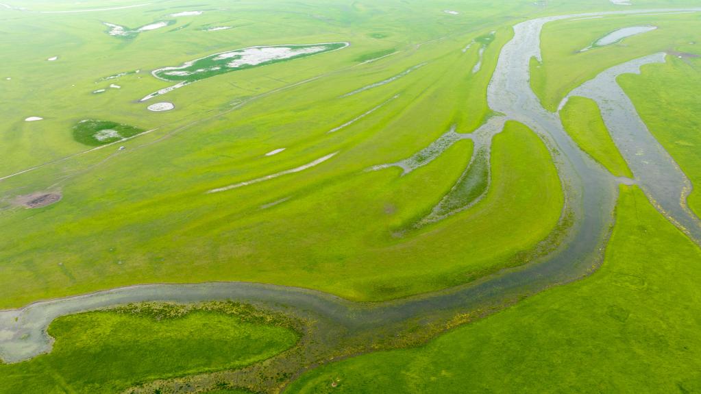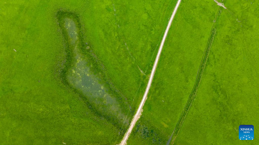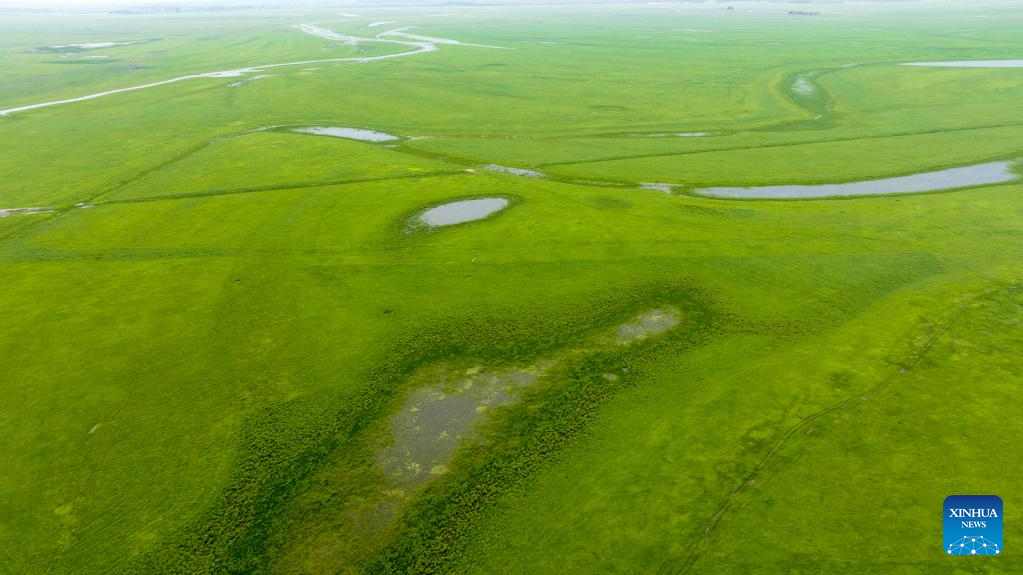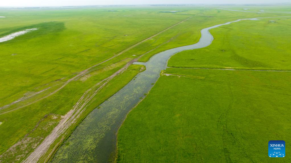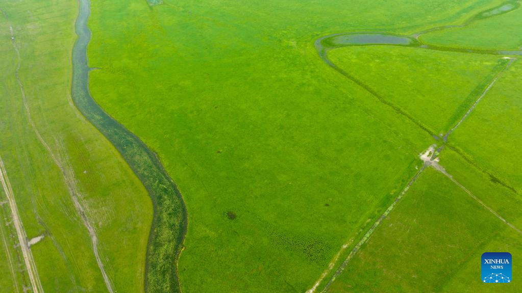 Aerial photo taken on June 20, 2022 shows the Nenjiang Wetland in Zhenlai County, Baicheng City of northeast China's Jilin Province. Located in the west of Jilin Province, Zhenlai County had long troubled by drought, sandstorm and soil salinization. In recent years, Zhenlai County has rolled out ecological projects to restore wetland areas. Since 2017, 703,000 mu (about 46,867 hectares) of wetlands have been restored, and the biodiversity here has been improved. (Xinhua/Zhang Nan)