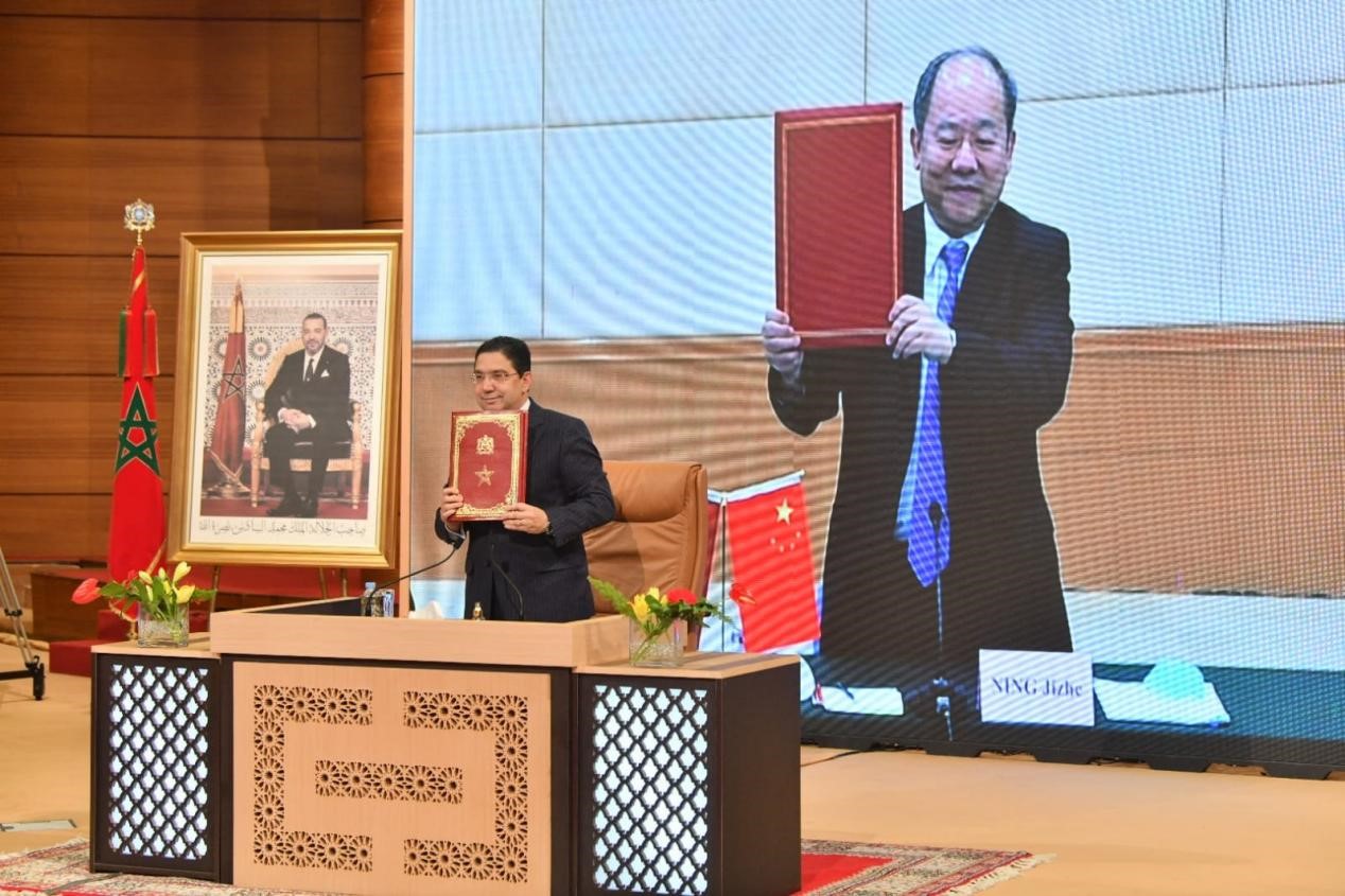 Ning Jizhe, Deputy Chairman of China's National Development and Reform Commission and Moroccan Foreign Minister Nasser Bourita sign the Implementation Plan of Jointly Building the Belt and Road Initiative (BRI) between the Government of the People's Republic of China and the Government of the Kingdom of Morocco, Jan. 5, 2022. Morocco is the the first country in North Africa to sign a BRI cooperation plan with China. (Photo courtesy of the Chinese Embassy in the Kingdom of Morocco)