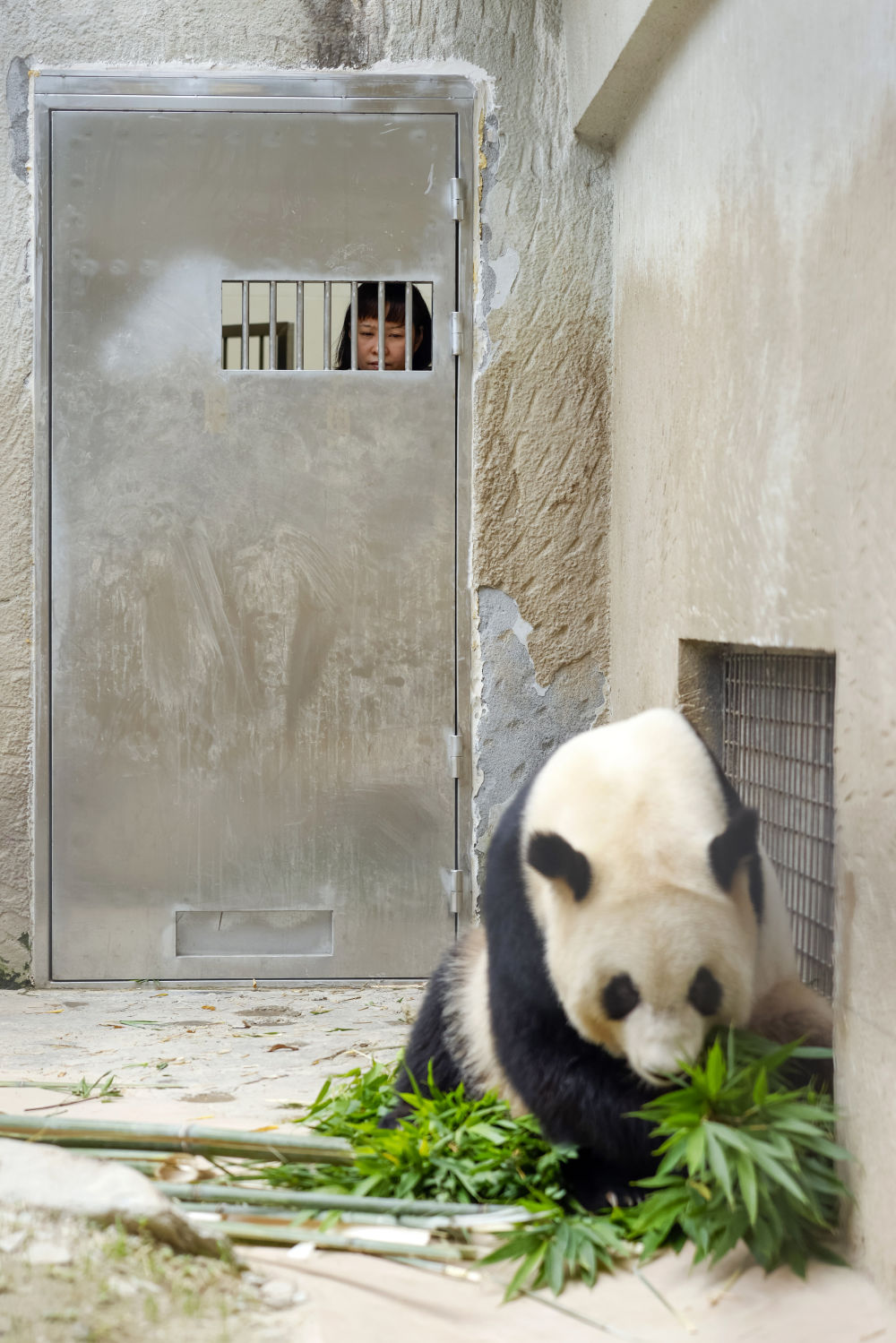Lang Shunyun watches over giant panda “Pan Yue” eating bamboo on June 21, 2022. (Xinhua/Shen Bohan)