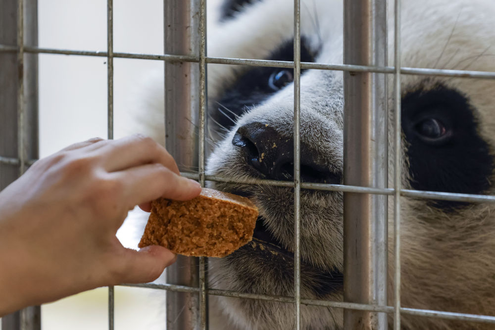 Lang Shunyun, a panda keeper, feeds the giant panda “Xiu Qiu” a steamed bun at the Shenshuping base of the China Conservation and Research Center for the Giant Panda in the Wolong National Nature Reserve, southwest China’s Sichuan Province, June 21, 2022. (Xinhua/Shen Bohan)