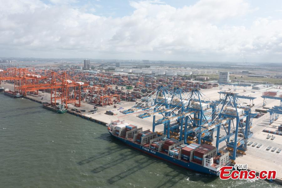Photo shows a container vessel from Indonesia docked at the Guangxi Beibu Gulf Qinzhou Port, marking the successful berthing at China's first sea-rail automated container terminal, south China's Guangxi Zhuang Autonomous Region, June 27, 2022. (Photo: China News Service/Wang Weichen)