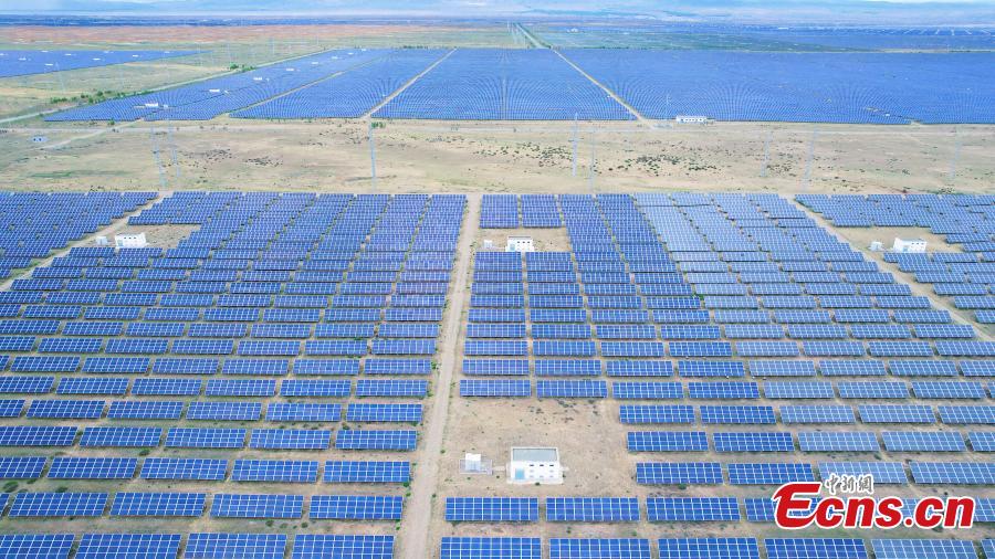 Aerial view shows a vast expanse of solar panels at the green industrial development park, the world's largest photovoltaic power park, with a maximum installed capacity of 8,430 MEGAwatts in the Tibetan Autonomous Prefecture of Hainan, northwest China's Qinghai Province, June 27, 2022. (Photo: China News Service/Ma Ming)