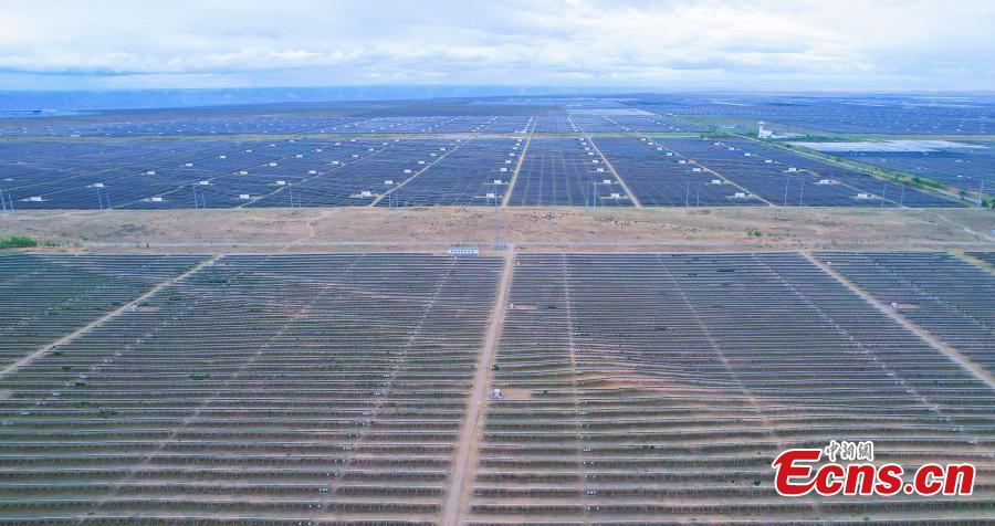 Aerial view shows a vast expanse of solar panels at the green industrial development park, the world's largest photovoltaic power park, with a maximum installed capacity of 8,430 MEGAwatts in the Tibetan Autonomous Prefecture of Hainan, northwest China's Qinghai Province, June 27, 2022. (Photo: China News Service/Ma Ming)