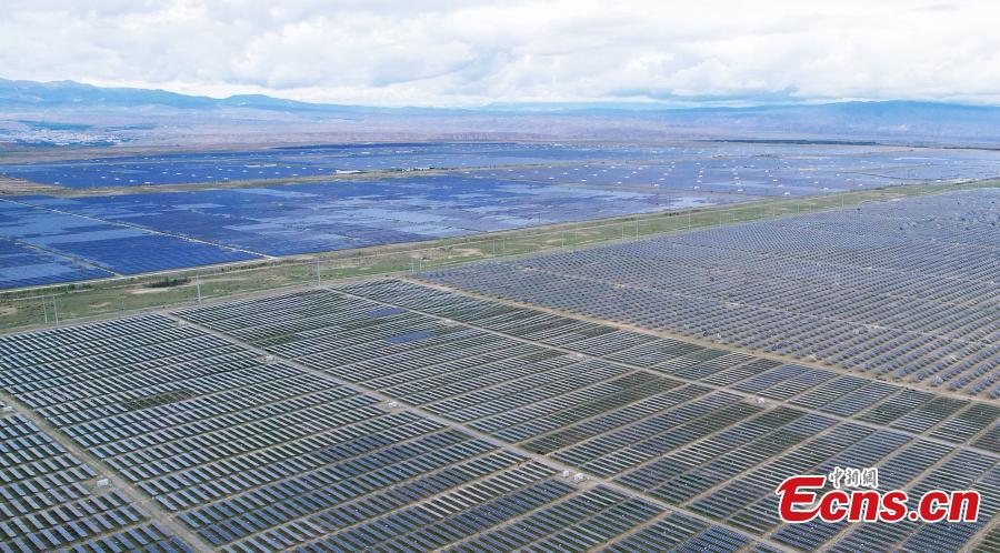 Aerial view shows a vast expanse of solar panels at the green industrial development park, the world's largest photovoltaic power park, with a maximum installed capacity of 8,430 MEGAwatts in the Tibetan Autonomous Prefecture of Hainan, northwest China's Qinghai Province, June 27, 2022. (Photo: China News Service/Ma Ming)