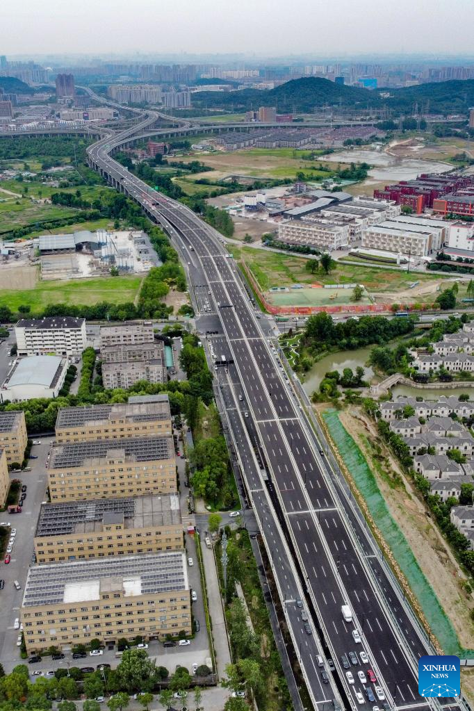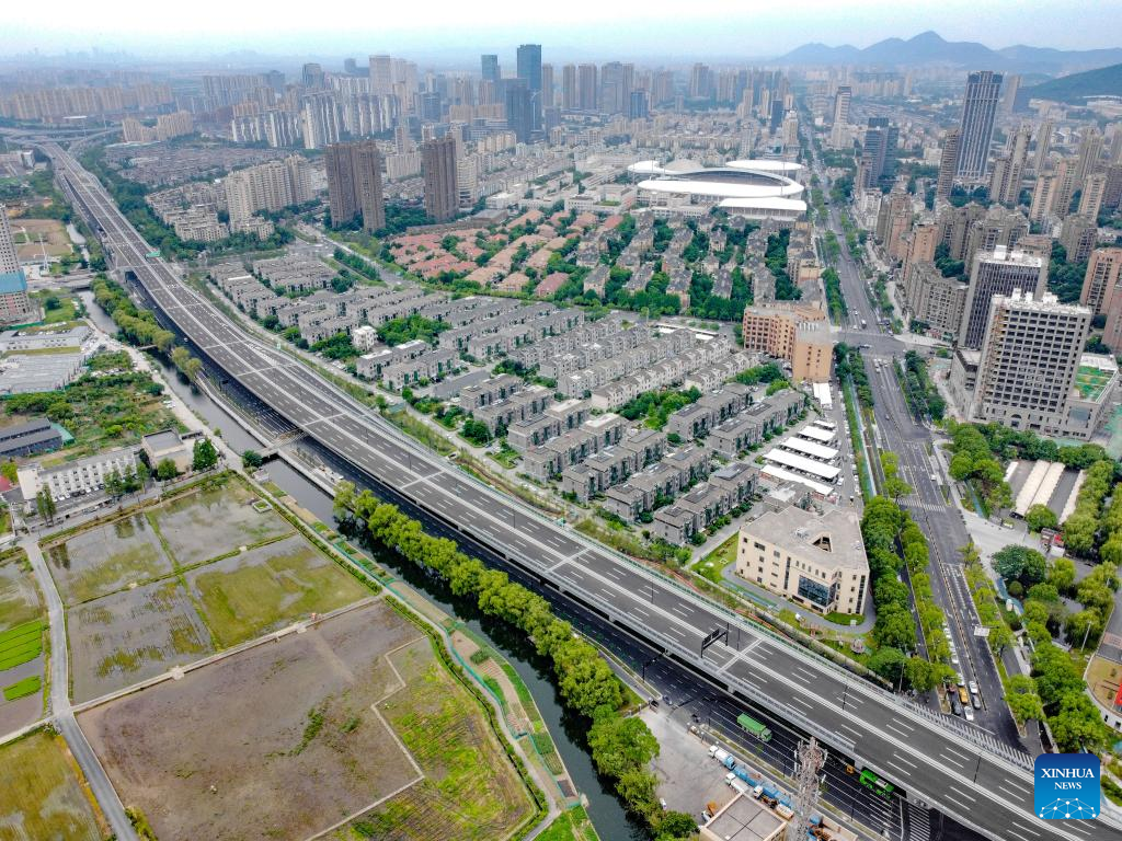 Aerial photo taken on June 28, 2022 shows the second phase of Donghu Overpass in Hangzhou, east China's Zhejiang Province. The second phase of Donghu Overpass and Wangmei Overpass Tuesday opened to traffic in Hangzhou. The two overpasses will facilitate commuters by easing traffic congestion and cutting travel time between Linping District and the city's main urban area. (Xinhua/Jiang Han)