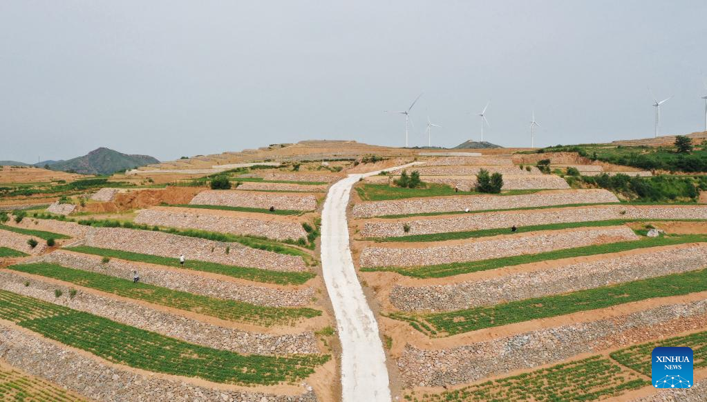 Villagers work in terraced fields in Huojiagou Village of Shimen Town in Lulong County, north China's Hebei Province, June 27, 2022. Recent years Lulong County has implemented the land transformation of barren hills and wild grass land into terraced fields. Farming facilities including field paths and drainage channels have been constructed to improve agricultural production conditions. (Xinhua/Yang Shiyao)