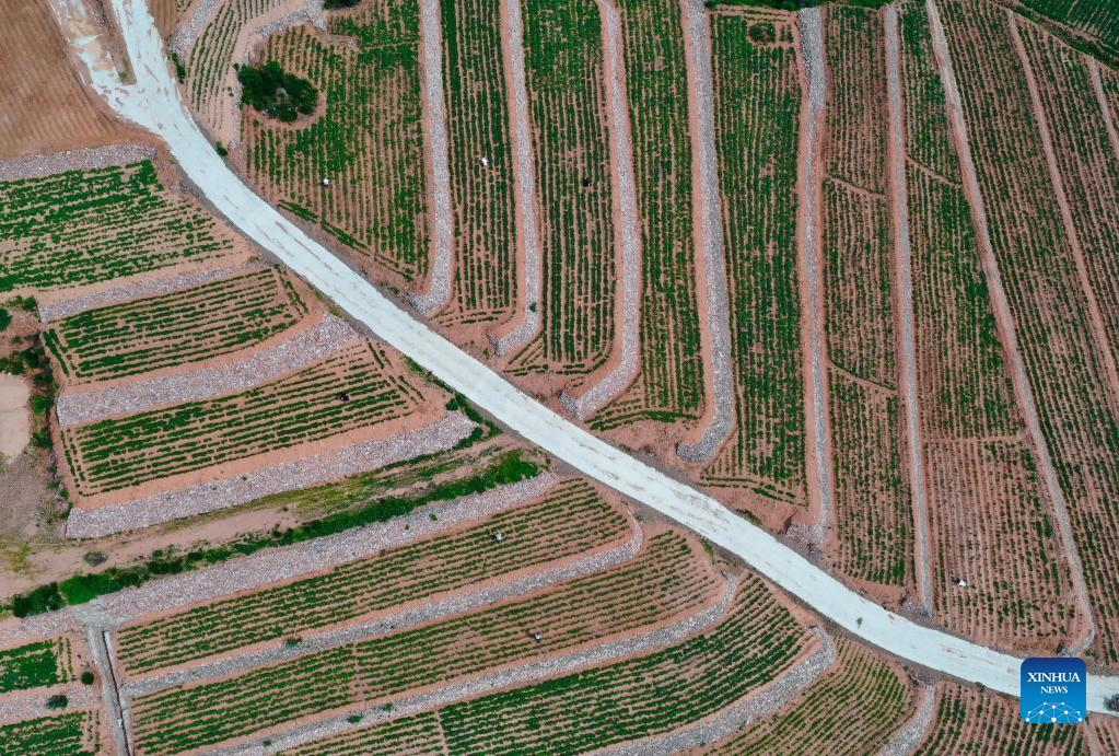 Aerial photo taken on June 27, 2022 shows terraced fields in Huojiagou Village of Shimen Town in Lulong County, north China's Hebei Province. Recent years Lulong County has implemented the land transformation of barren hills and wild grass land into terraced fields. Farming facilities including field paths and drainage channels have been constructed to improve agricultural production conditions. (Xinhua/Yang Shiyao)