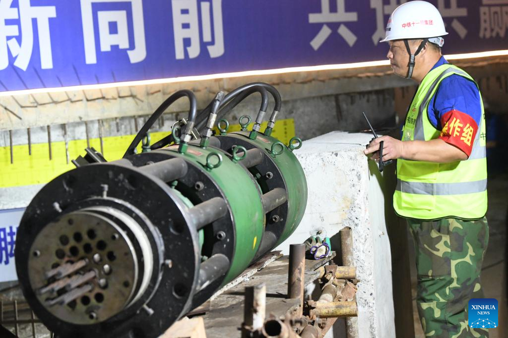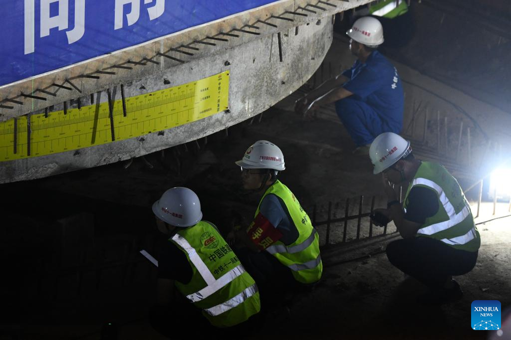 Staff members work on the construction site of the Nakuan super major bridge along the Nanning-Yulin railway in Liujing Town of Hengzhou, south China's Guangxi Zhuang Autonomous Region, June 28, 2022.
