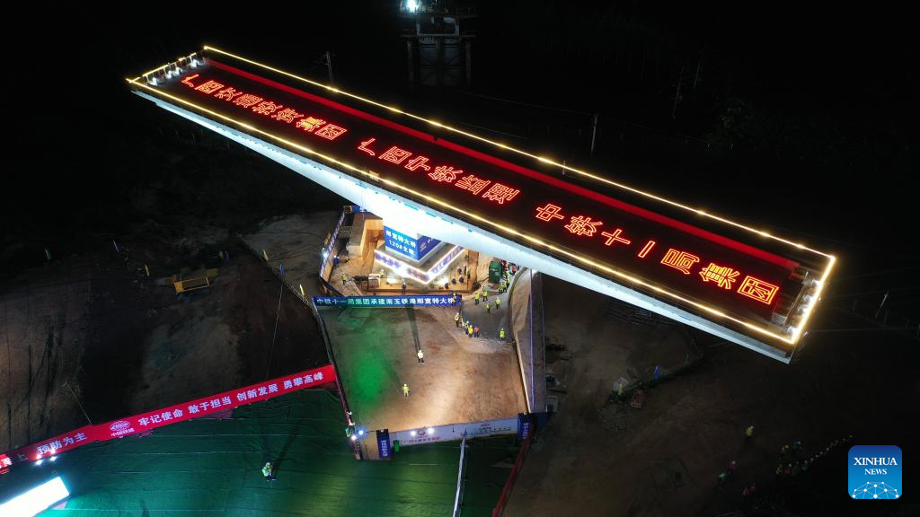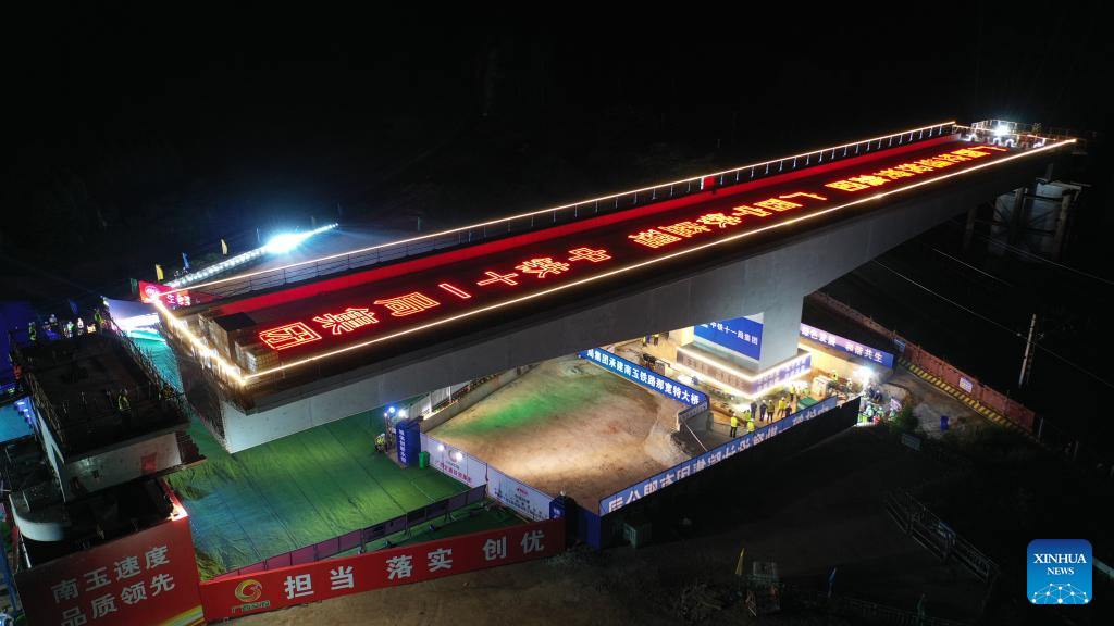 The Nakuan super major bridge along the Nanning-Yulin railway was successfully rotated to its targeted position in Liujing Town on Tuesday. The Nanning-Yulin railway has a designed speed of 350 km per hour. (Xinhua/Zhang Ailin)