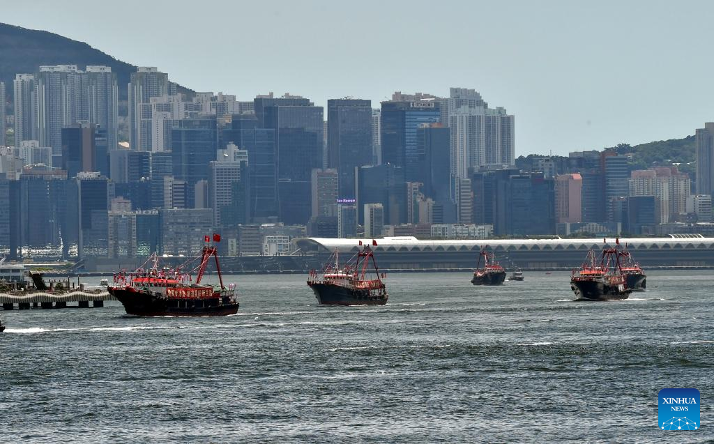 Fishing vessels flying China's national flags and the flags of the Hong Kong Special Administrative Region (HKSAR) sail in a procession at Victoria Harbour in Hong Kong, south China, June 28, 2022. The Hong Kong Celebrations Association has launched a string of activities to celebrate the 25th anniversary of Hong Kong's return to the motherland. (Xinhua/Lo Ping Fai)