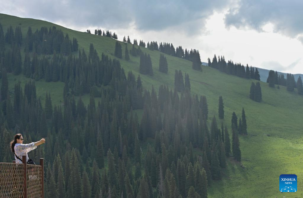 A visitor takes photos at the Narat scenic spot in Xinyuan County, northwest China's Xinjiang Uygur Autonomous Region, June 28, 2022. (Xinhua/Hao Jianwei)