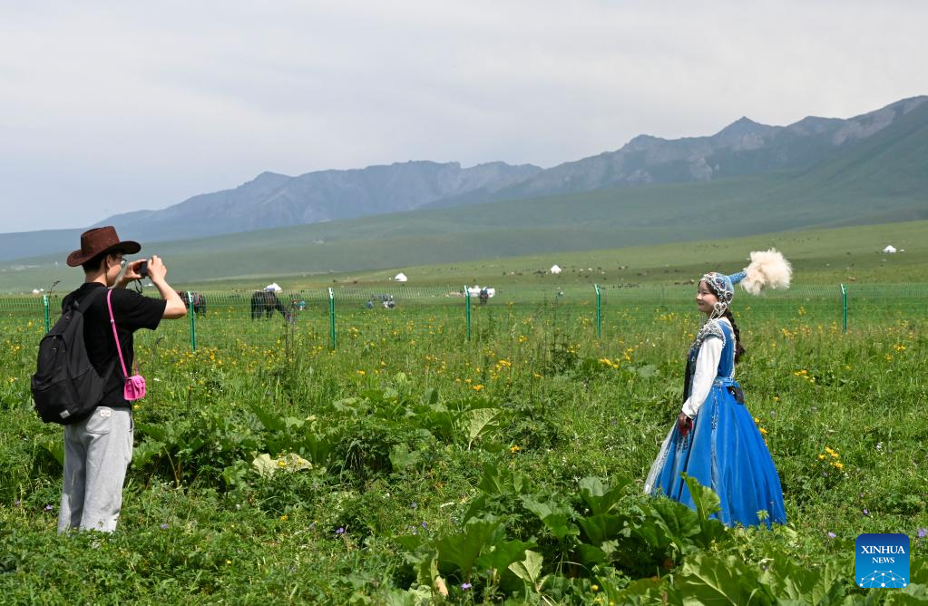 Visitors take photos at the Narat scenic spot in Xinyuan County, northwest China's Xinjiang Uygur Autonomous Region, June 28, 2022. (Xinhua/Hao Jianwei)
