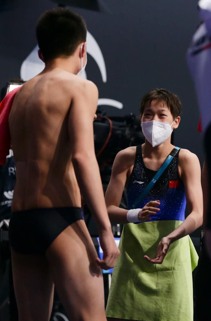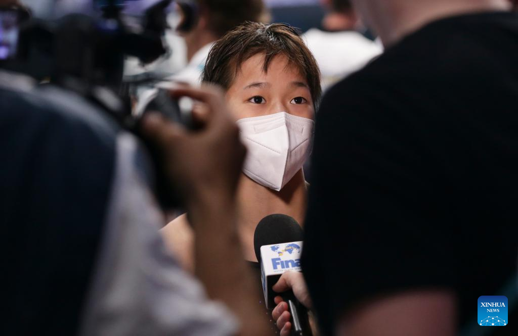 Quan Hongchan of China gets interviewed after the mixed 3m&10m team final of diving at the 19th FINA World Championships in Budapest, Hungary, June 29, 2022. (Xinhua/Zheng Huansong)