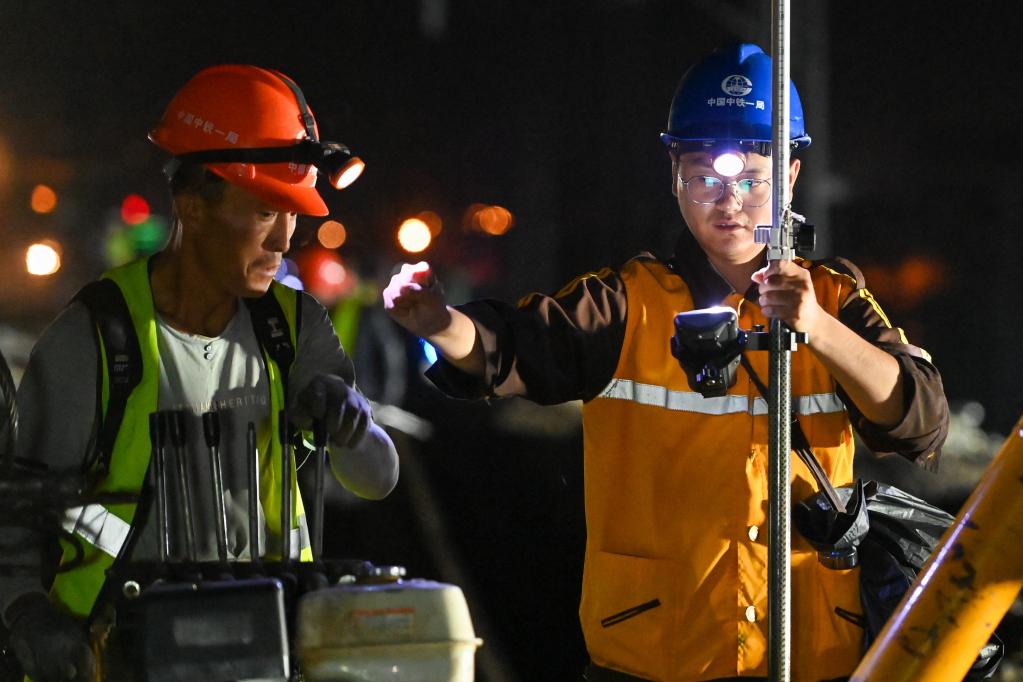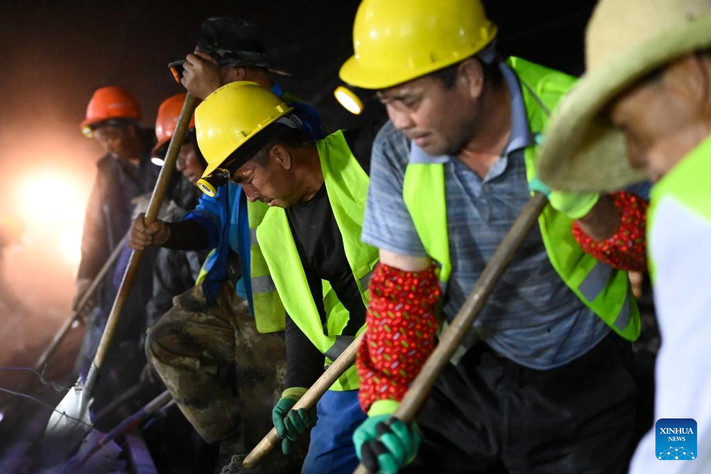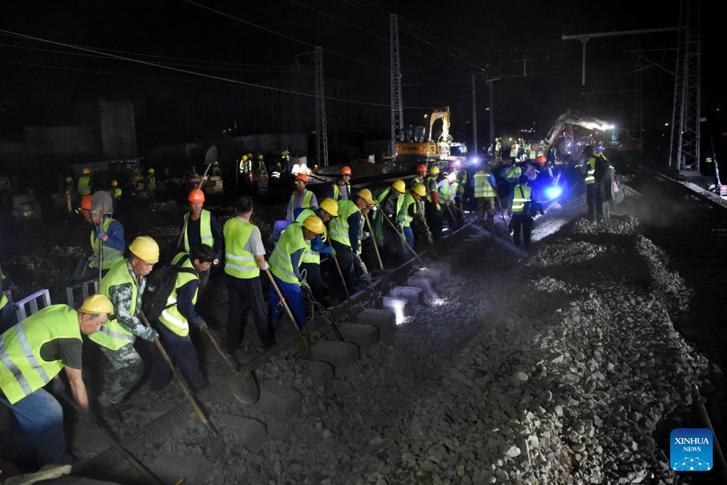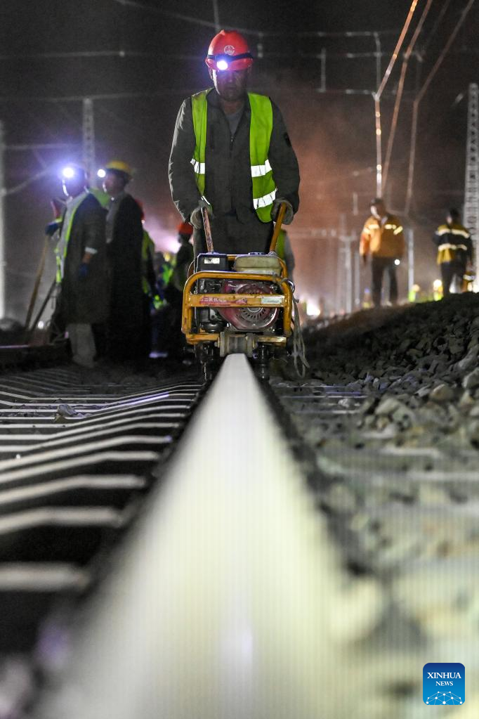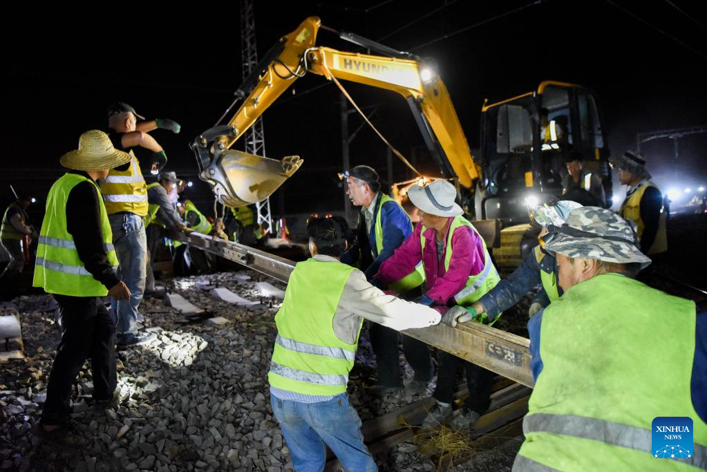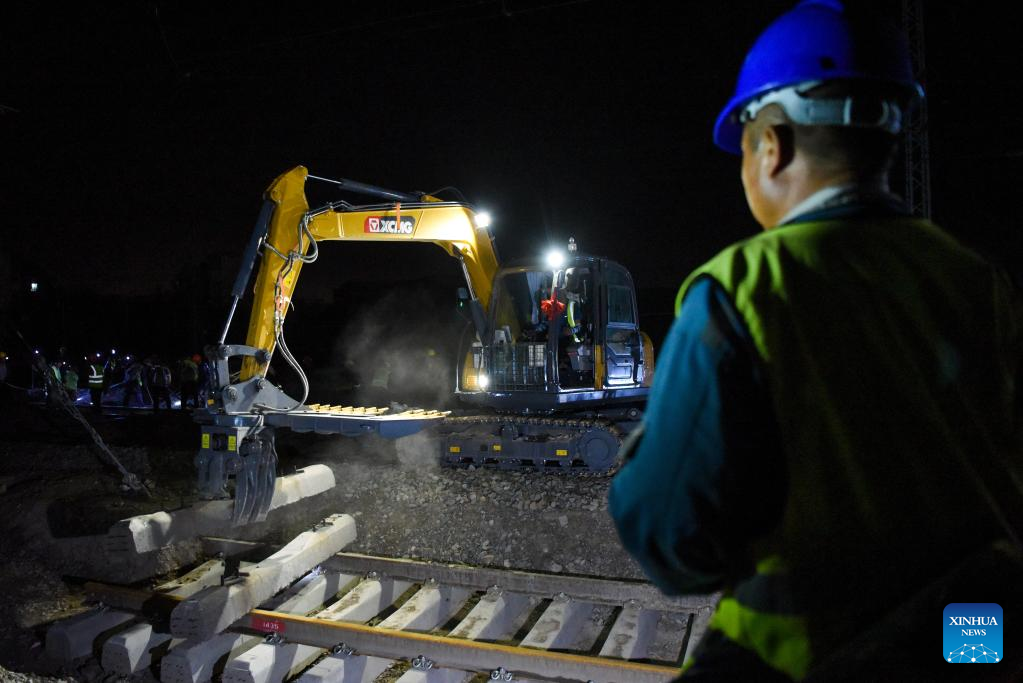 Staff members work at the construction site of the Diwopu railway station in northwest China's Xinjiang Uygur Autonomous Region, June 29, 2022. The Diwopu railway station was put into operation on June 29, marking a milestone of the expansion of a railway linking Urumqi north railway station and Jiangjunmiao mining area.