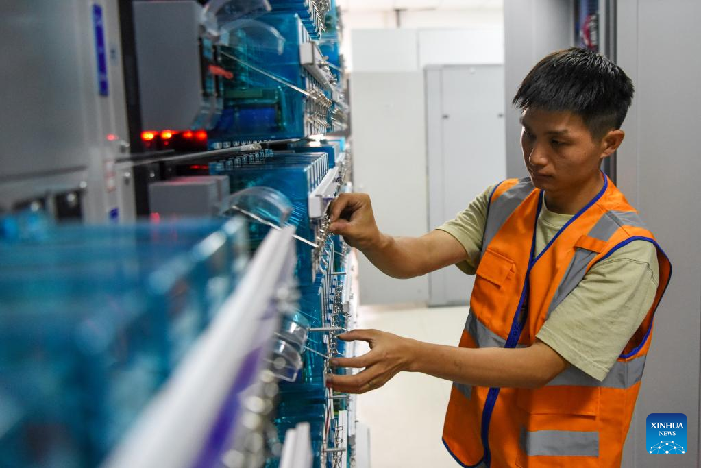 A staff member works at a signal equipment room of the Diwopu railway station in northwest China's Xinjiang Uygur Autonomous Region, June 28, 2022. The Diwopu railway station was put into operation on June 29, marking a milestone of the expansion of a railway linking Urumqi north railway station and Jiangjunmiao mining area.