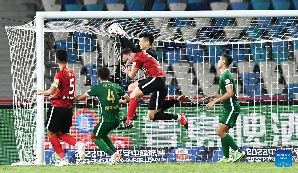 Goalkeeper Zhao Bo (rear) of Zhejiang makes a save during a 2022 season Chinese Football Association Super League (CSL) match between Changchun Yatai and Zhejiang in Haikou, south China's Hainan Province, June 29, 2022. (Xinhua/Yang Guanyu)