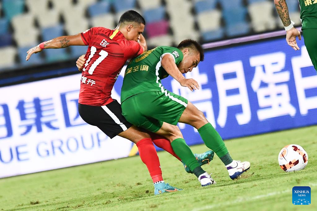 Dong Yu (R) of Zhejiang vies with Erik Nascimento Lima of Changchun Yatai during a 2022 season Chinese Football Association Super League (CSL) match in Haikou, south China's Hainan Province, June 29, 2022. (Xinhua/Yang Guanyu)