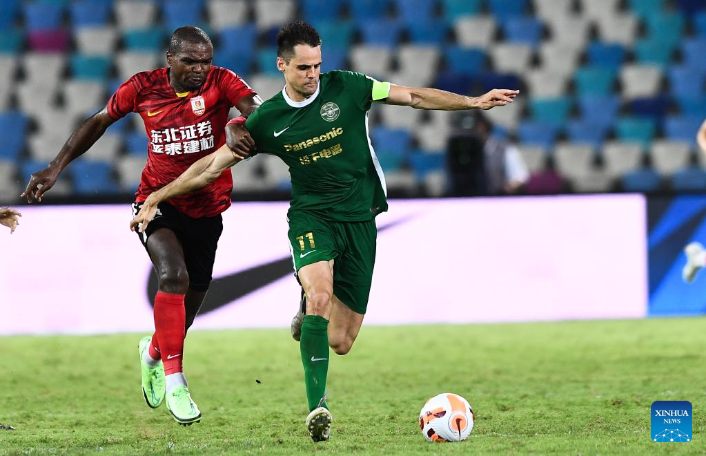 Franko Andrijasevic (R) of Zhejiang vies with Jores Okore of Changchun Yatai during a 2022 season Chinese Football Association Super League (CSL) match in Haikou, south China's Hainan Province, June 29, 2022. (Xinhua/Yang Guanyu)