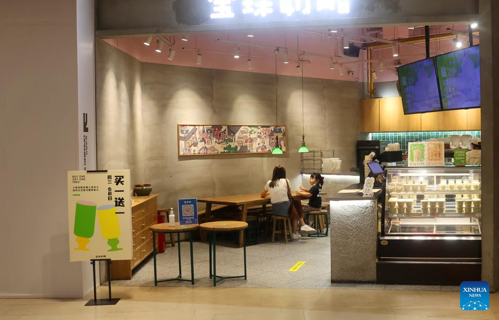 Customers enjoy ice cream at a dessert shop in Minhang District, east China's Shanghai, June 29, 2022. China's financial hub Shanghai is gradually resuming dine-in services at restaurants starting from Wednesday as the COVID-19 epidemic has waned in the city. (Xinhua/Fang Zhe)