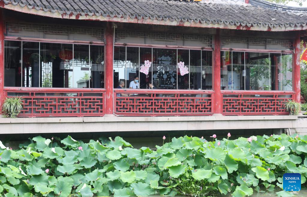 A waitress serves customers at a teahouse in Minhang District, east China's Shanghai, June 29, 2022. China's financial hub Shanghai is gradually resuming dine-in services at restaurants starting from Wednesday as the COVID-19 epidemic has waned in the city. (Xinhua/Fang Zhe)