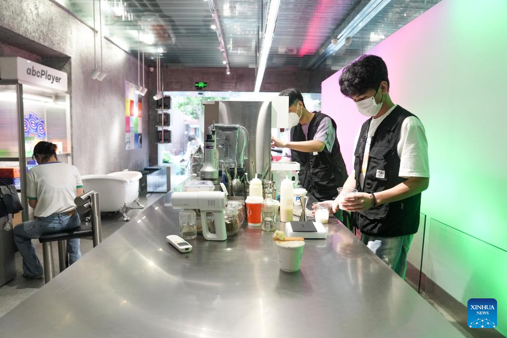 Baristas prepare coffee at a cafe in east China's Shanghai, June 29, 2022. China's financial hub Shanghai is gradually resuming dine-in services at restaurants starting from Wednesday as the COVID-19 epidemic has waned in the city. (Xinhua/Ding Ting)