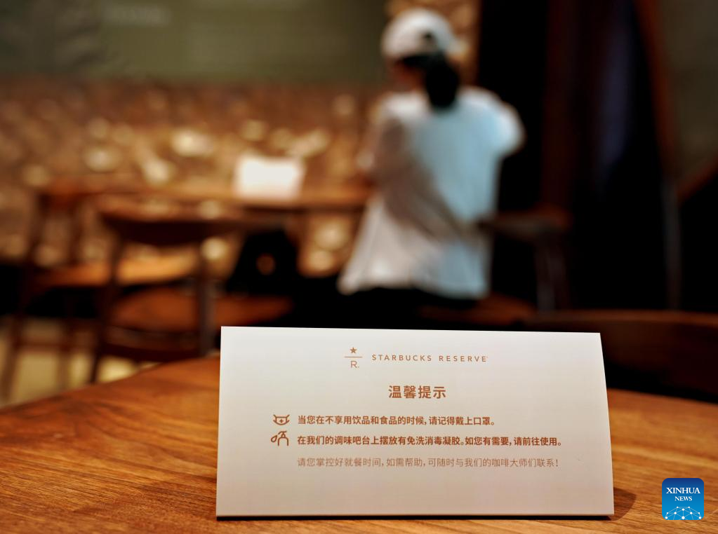 Photo taken on June 29, 2022 shows a card with epidemic control and prevention tips at the Starbucks Reserve Roastery in Shanghai, east China. China's financial hub Shanghai is gradually resuming dine-in services at restaurants starting from Wednesday as the COVID-19 epidemic has waned in the city. (Xinhua/Liu Ying)