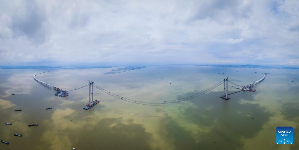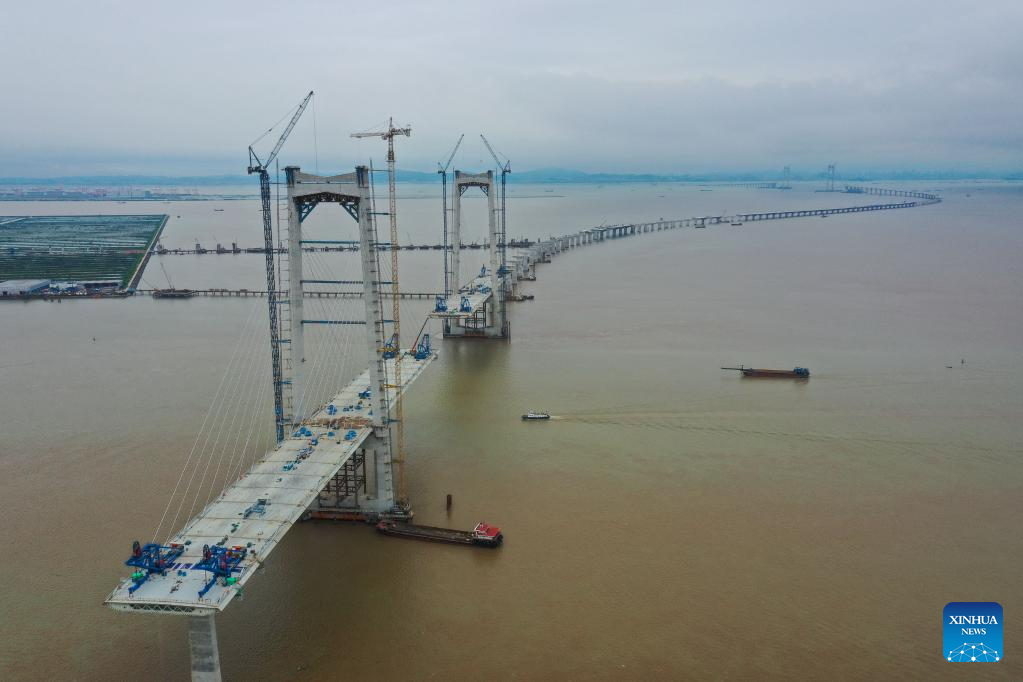 Photo taken on June 7, 2022 shows the construction site of the Lingdingyang Bridge, one of the key projects of the Shenzhen-Zhongshan highway link, in south China's Guangdong Province. The total length of Shenzhen-Zhongshan highway link will be 24 kilometers and include an underwater tunnel and two artificial islands. The link will open to traffic in 2024.