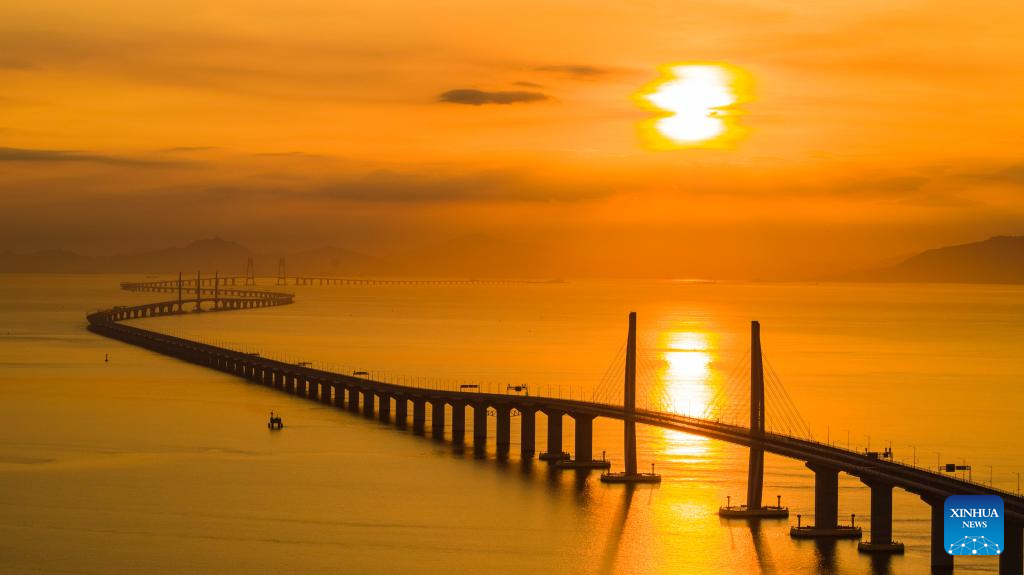 Aerial photo taken on Aug. 7, 2019 shows a view of the Hong Kong-Zhuhai-Macao Bridge at sunrise, south China. The 55-kilometer-long bridge, situated in the Lingdingyang waters of the Pearl River Estuary, is the world's longest bridge-tunnel combined cross-sea passage.