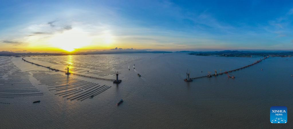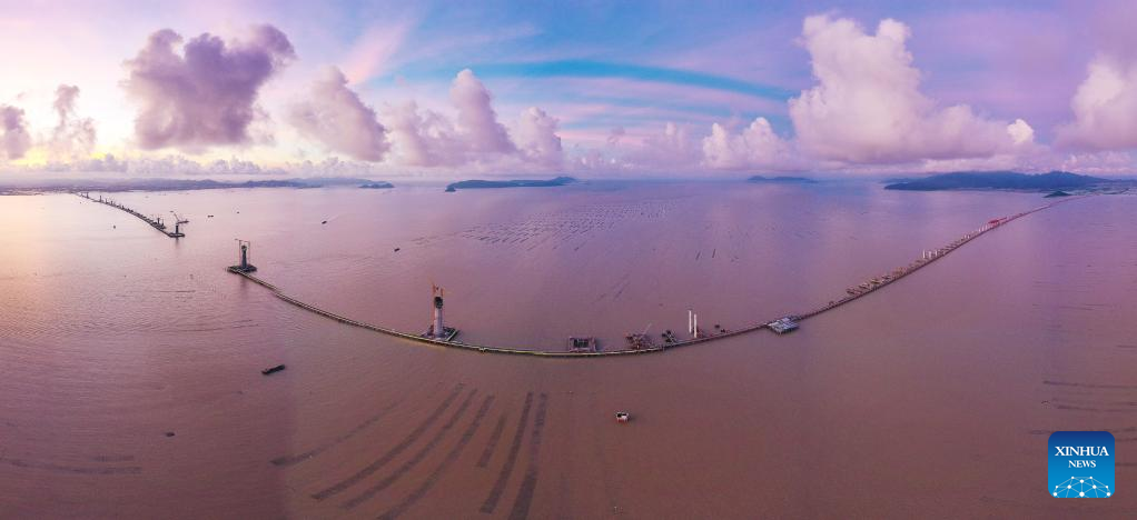 Aerial photo taken on June 28, 2022 shows the construction site of a 31-kilometer-long cross-sea link connecting Jiangmen City and Zhuhai City, south China's Guangdong Province. The link will open to traffic in 2024.