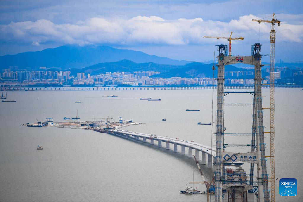 Aerial photo taken on May 15, 2022 shows the Shenzhen-Zhongshan highway link under construction in south China's Guangdong Province. The total length of Shenzhen-Zhongshan highway link will be 24 kilometers and include an underwater tunnel and two artificial islands. The link will open to traffic in 2024.
